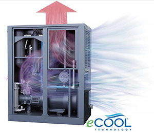 離心風機位于機體內部的一系列吸入孔同時將機組內部的熱空氣向頂部排出。這一冷卻流場設計,使空壓機內部始終保持較低溫度,同時大大降低因風扇動作而產生的噪音。